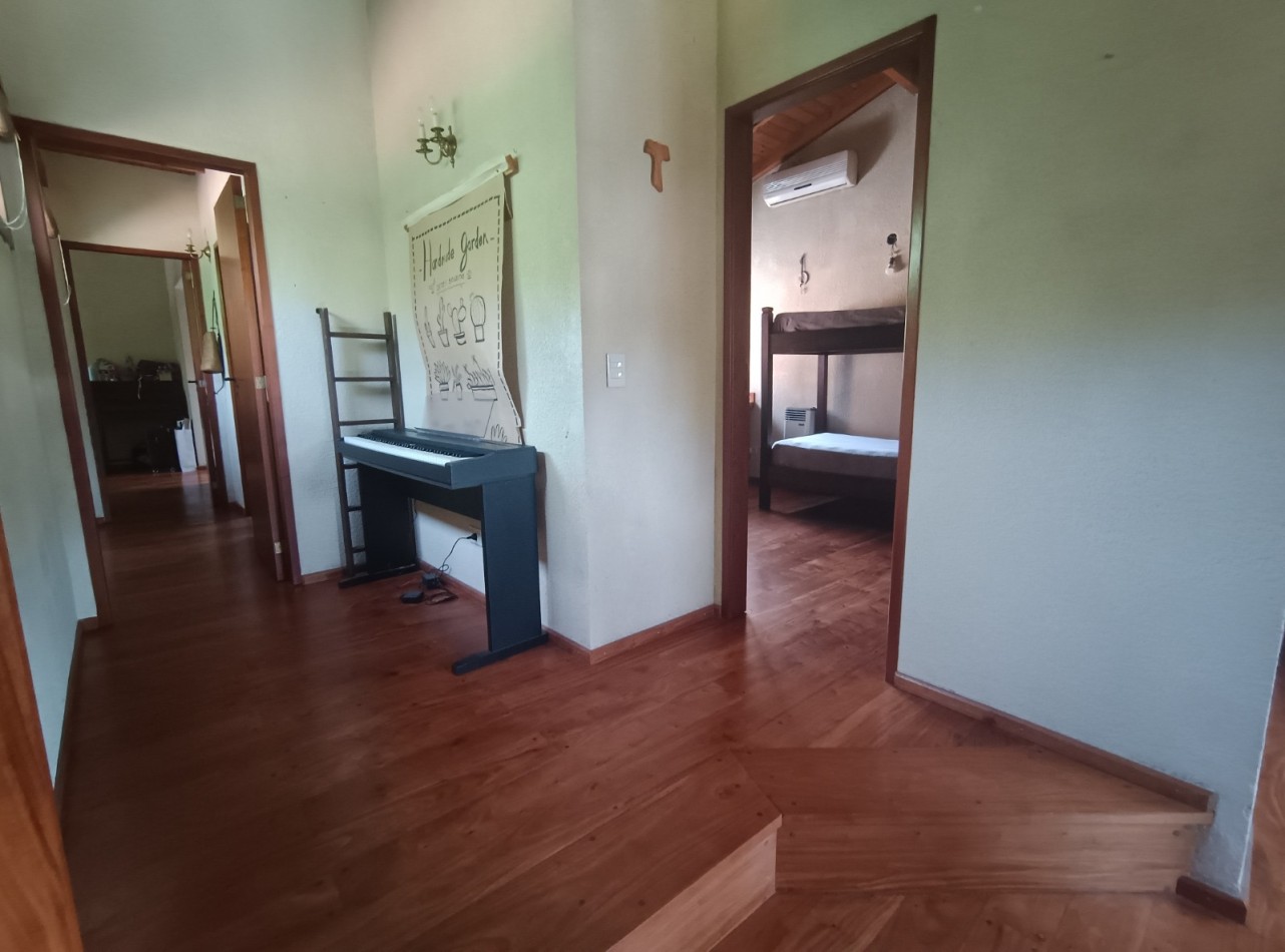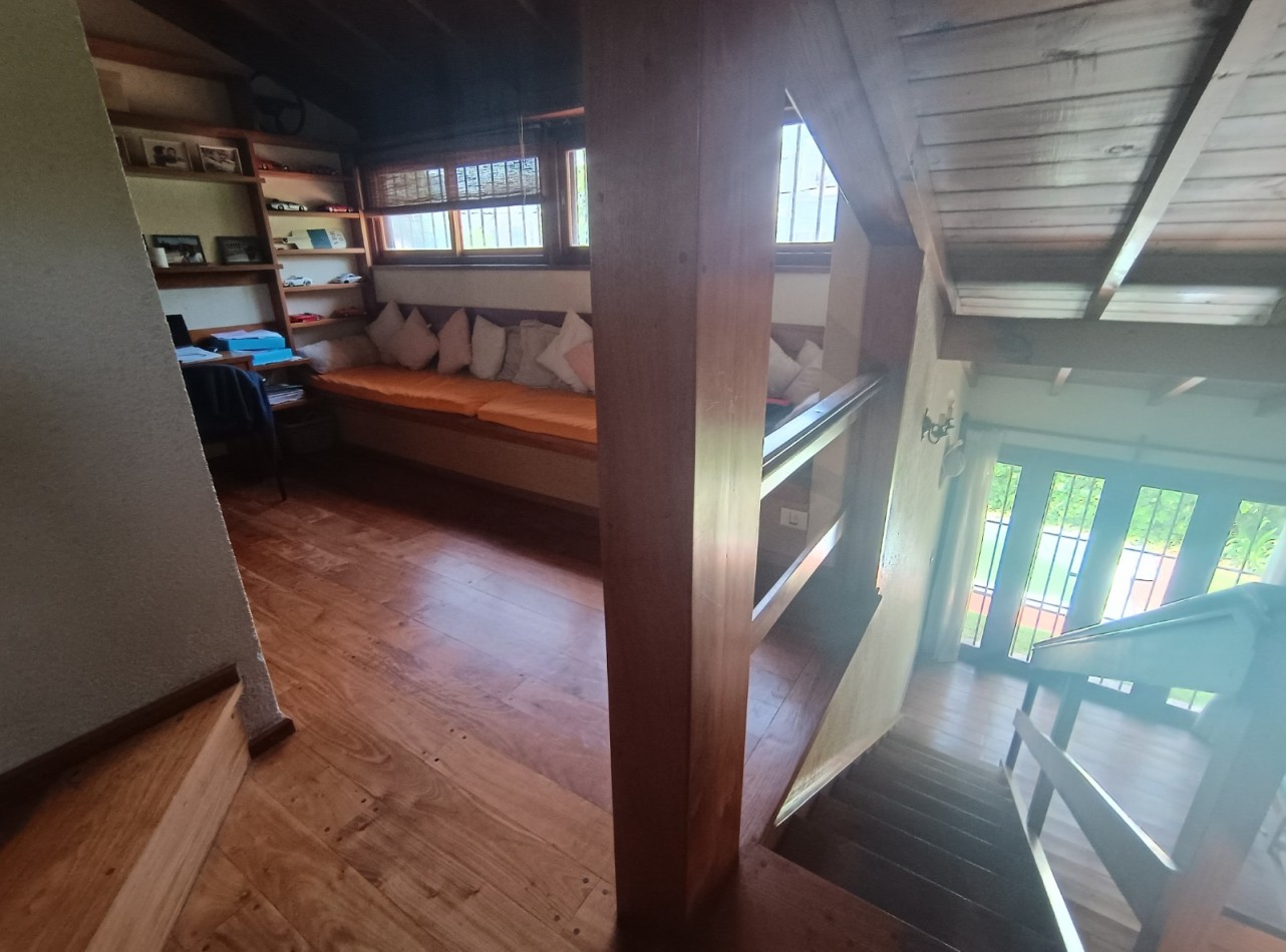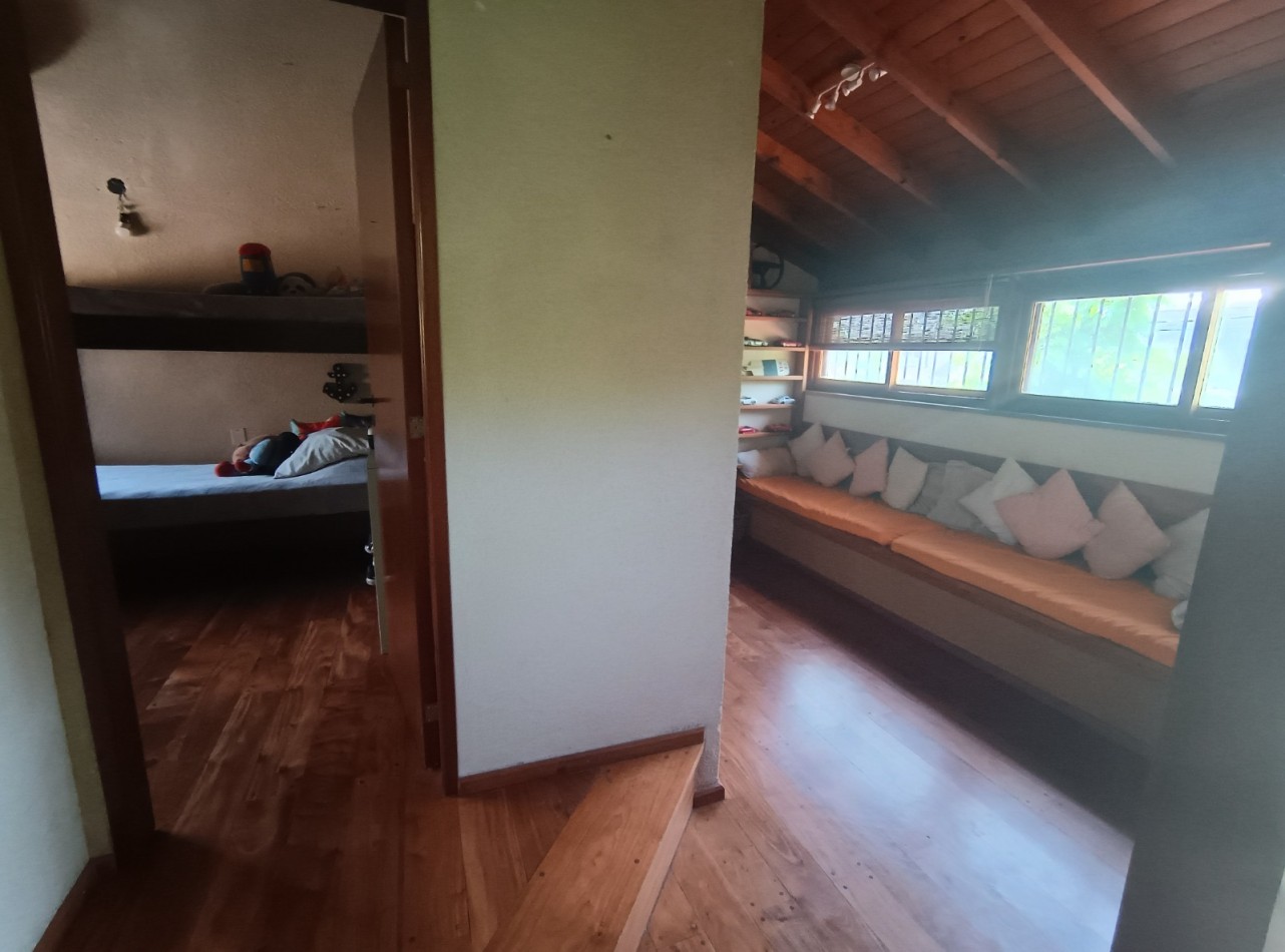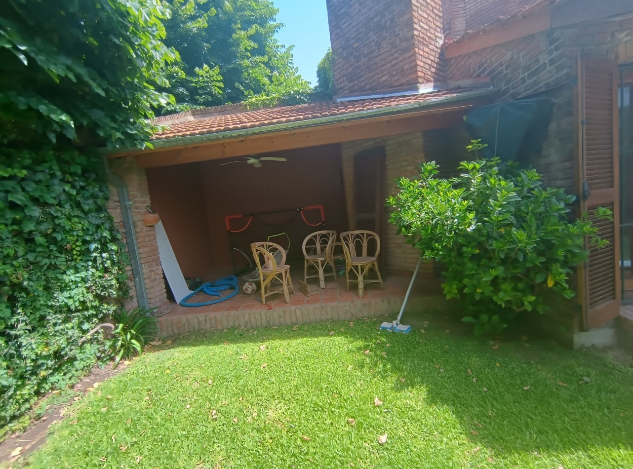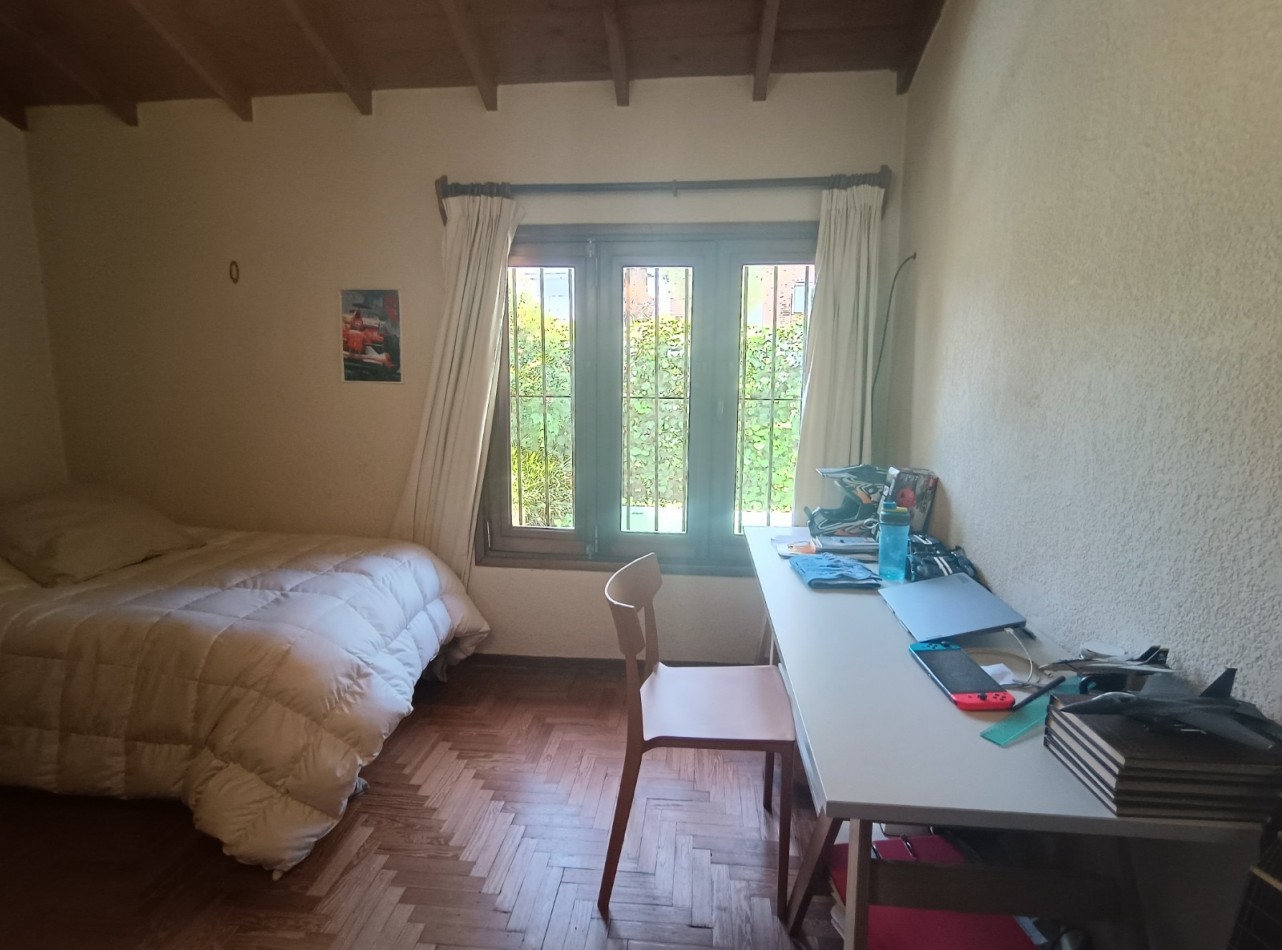 Este chalet es de 5 ambientes con garage, parque y pileta. En planta baja encontramos amplio living comedor en desnivel con salida al parque, cocina comedor muy amplia, un baño completo, dos dormitorios con placards, garage con parrilla, parque con pileta. En planta alta un playroom, dos dormitorios, el dormitorio principal en suite con vestidor y baño completo. Cabe destacar que la planta alta tiene una antigüedad de 10 años aproximadamente. Cuenta con todos los servicios. Muy buen estado de conservación.