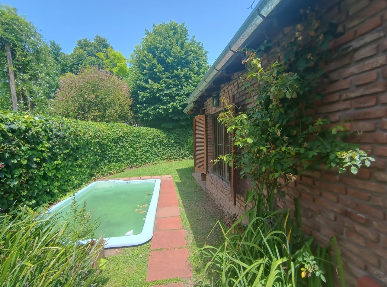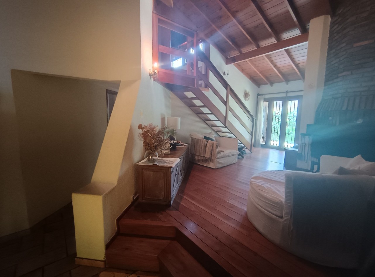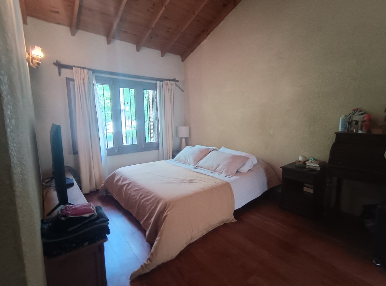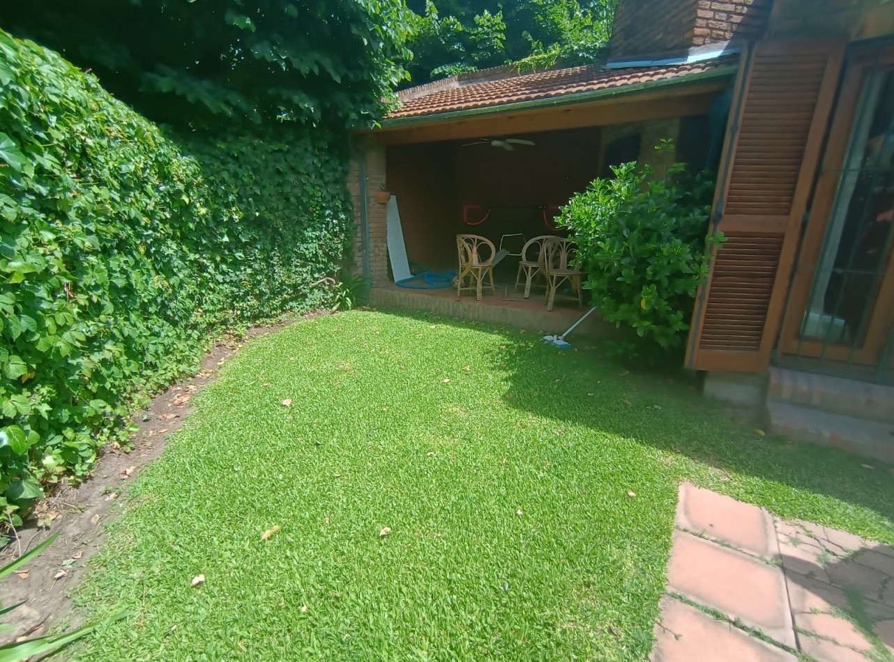 Este chalet es de 5 ambientes con garage, parque y pileta. En planta baja encontramos amplio living comedor en desnivel con salida al parque, cocina comedor muy amplia, un baño completo, dos dormitorios con placards, garage con parrilla, parque con pileta. En planta alta un playroom, dos dormitorios, el dormitorio principal en suite con vestidor y baño completo. Cabe destacar que la planta alta tiene una antigüedad de 10 años aproximadamente. Cuenta con todos los servicios. Muy buen estado de conservación.